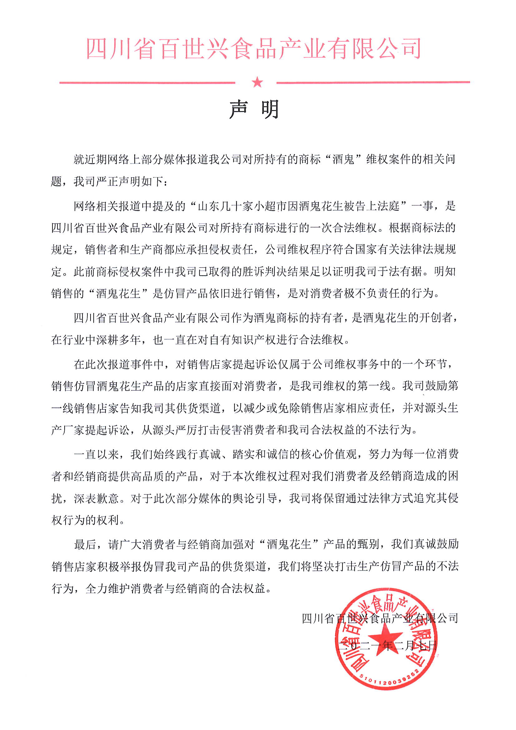 百世興食品關(guān)于“酒鬼花生打假山東超市”事件聲明
